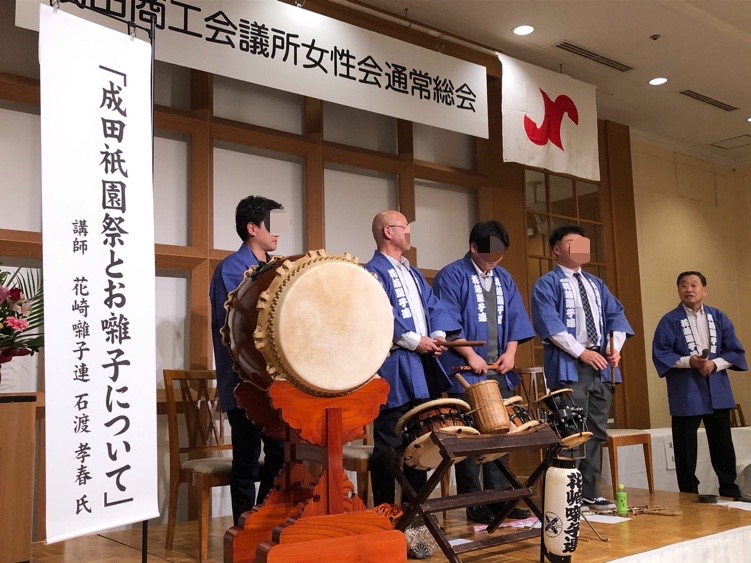 「成田祇園祭とそのお囃子について」というテーマで、私と花崎囃子連から別府弘隆下座長、宮嶋勇丞、高校生2名を伴って、30分の予定で講演を致しました。前半、祇園祭の成り立ち、成田祇園祭の特徴、佐原ばやしについて等の講演、後半は解説を付けながらの下座の実演、その後質疑応答とかなり中身の濃い内容でしたので、やはり時間をちょっとオーバーしてしまいました。それでも参加された皆様の反応がたいへん良く、喜んでいただけたことが実感でき、我々一同もたいへん楽しい時間を過ごさせていただきました。